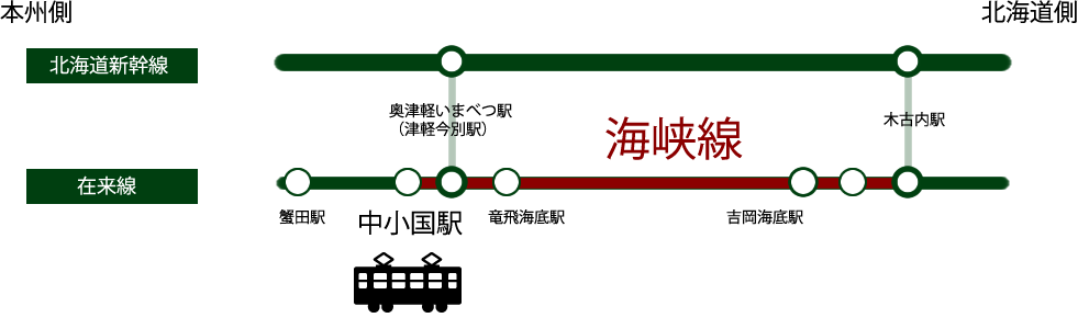 海峡線へ入ると、新幹線も走行できる設計のため、在来線の狭軌(狭い軌間)1,067mmと新幹線の標準軌1,435 mmが両方ひかれている“三線軌条(さんせんきじょう)”となっている。