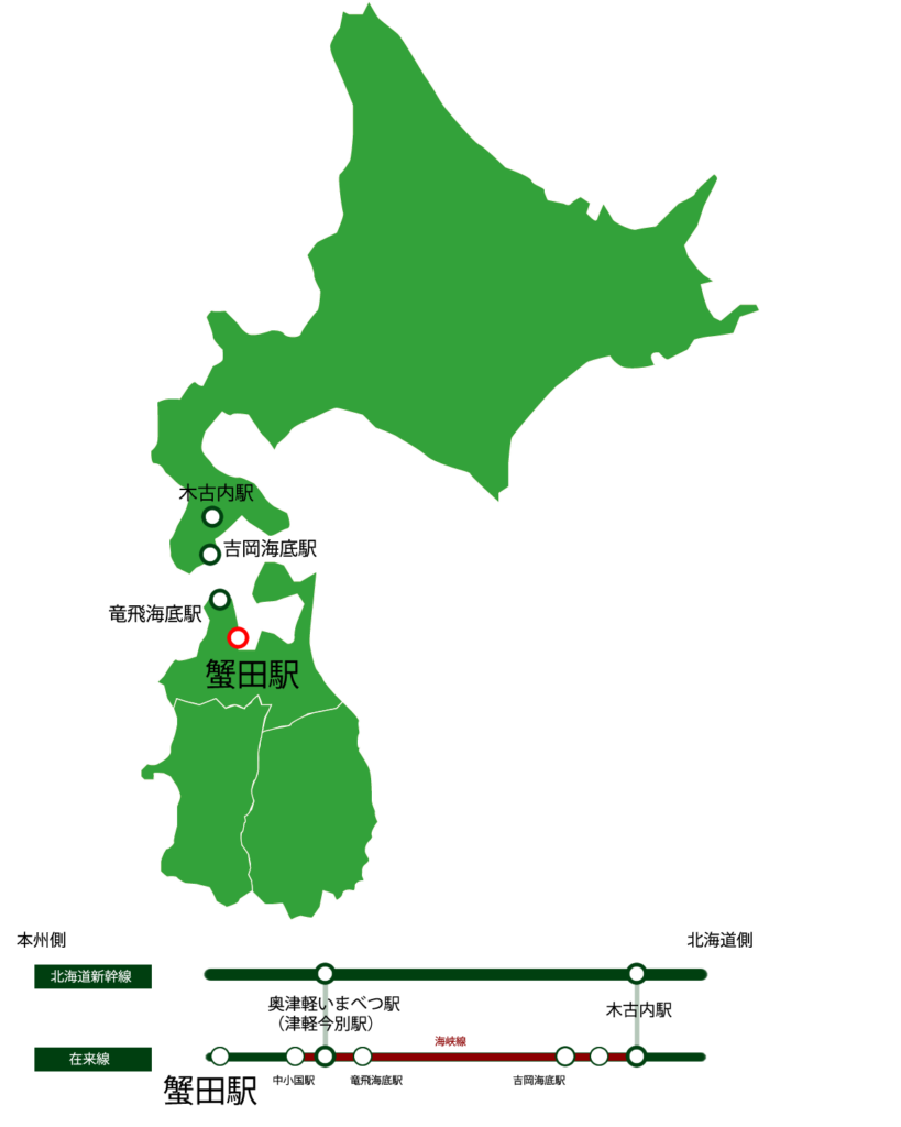特急白鳥号は本来蟹田駅を出発すると、次の停車駅は青函トンネルをくぐり北海道の木古内駅(きこないえき)だが、一部列車は「海底駅見学整理券」を持った旅客向けに竜飛海底駅に停車する。