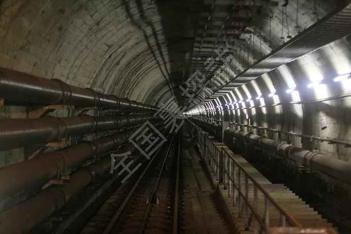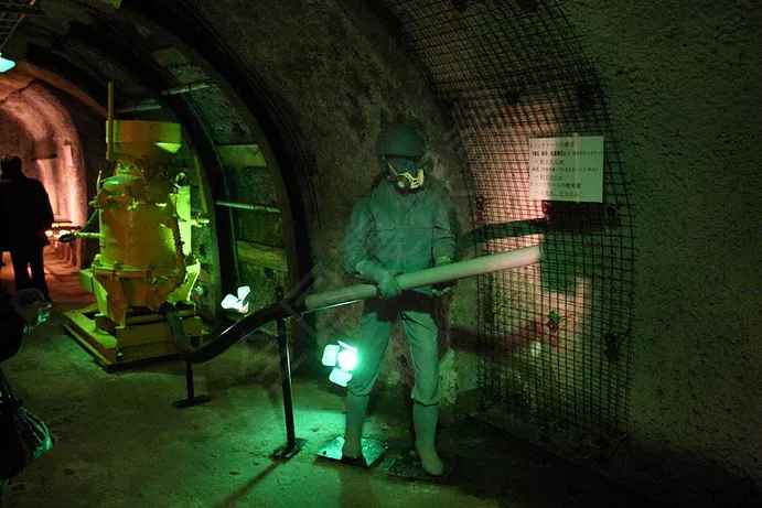 壁に「吹き付けコンクリート」を施工する作業員。作業坑、斜坑、先進導坑などの部分は中に金網を入れ吹き付けコンクリートで施工、約20cmのかぶり厚となっている。この吹き付けコンクリートは路盤の安定が早く作業効率が上がった。ちなみに本坑は約70㎝でかなり分厚い。