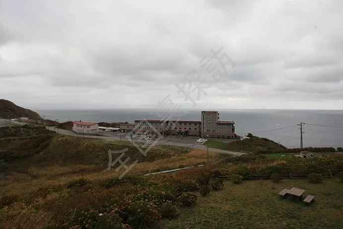 龍飛崎より北海道を望む。奥の建物上にうっすらと北海道が見えると思う。この海峡の海面下240mを青函トンネルは走る。