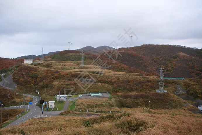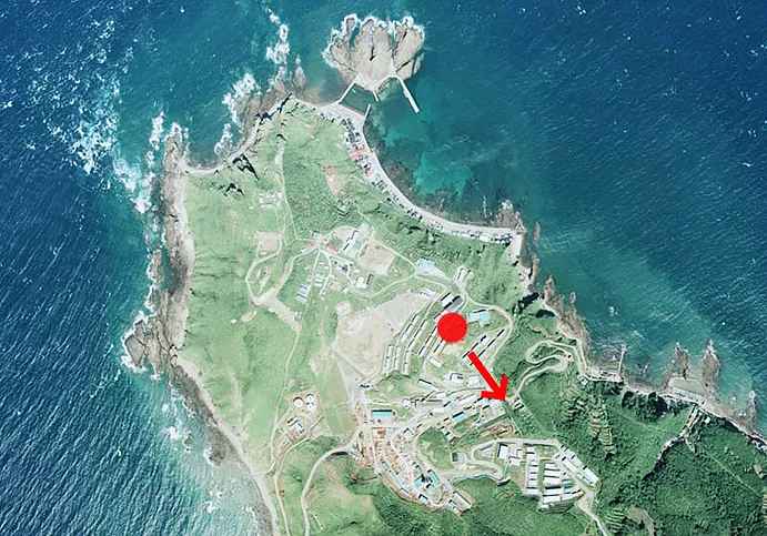 竜飛崎展望台から下写真の赤丸地点から矢印方面、南東方面を見る。今は建物はそれほどない。ただ1988年(昭和63年)の青函トンネル供用開始が始まり、保守のみの扱いとなったため、また大勢の人間が去っていった。まさに栄枯盛衰と言ったところか・・
